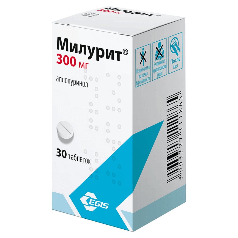 В начале курса лечения подагры может возникнуть обострение заболевания. Для профилактики можно применять НПВС или колхицин (по 0.5 мг 3 раза/сут). Следует учитывать, что при адекватной терапии аллопуринолом возможно растворение крупных уратных камней в почечной лоханке и последующее их попадание в мочеточник.