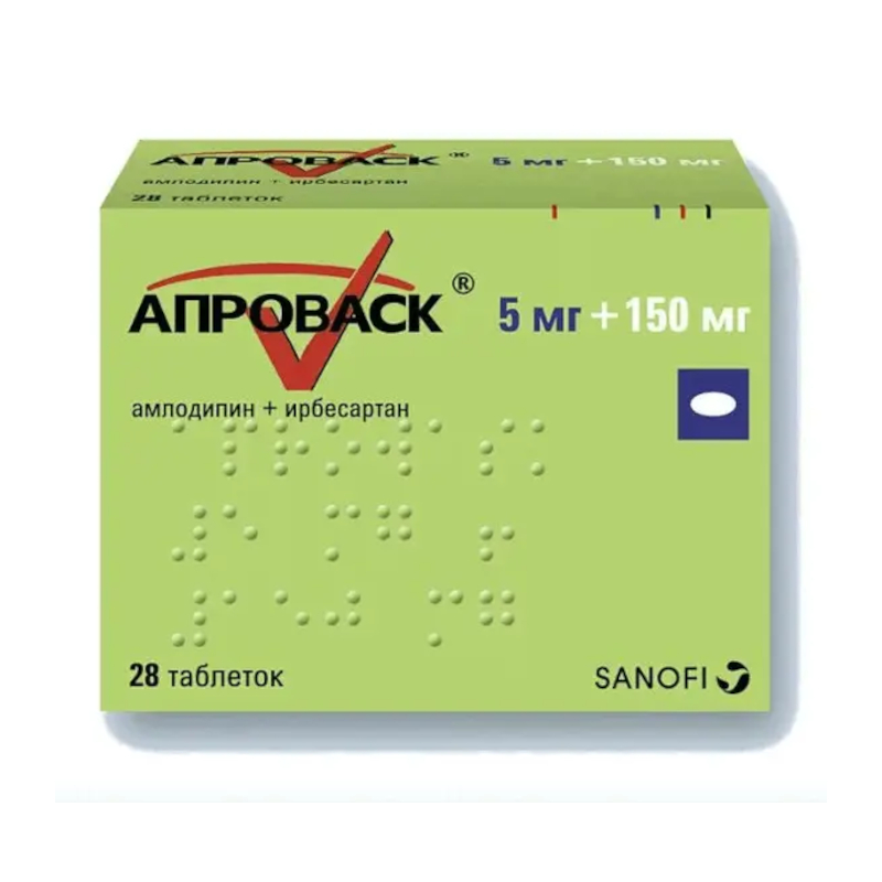 Фармакодинамические свойства каждого из действующих веществ, входящих в состав препарата Апроваск®, амлодипина и ирбесартана, способствуют их аддитивному антигипертензивному действию при применении в комбинации по сравнению с применением каждого из этих препаратов в отдельности. Как антагонисты рецепторов ангиотензина II (АРА II), так и блокаторы медленных кальциевых каналов (БМКК), снижают АД за счет снижения периферического сопротивления сосудов, однако блокада поступления кальция в клетку и уменьшение сосудосуживающего действия, обусловленного воздействием ангиотензина II, являются дополняющими друг друга механизмами.