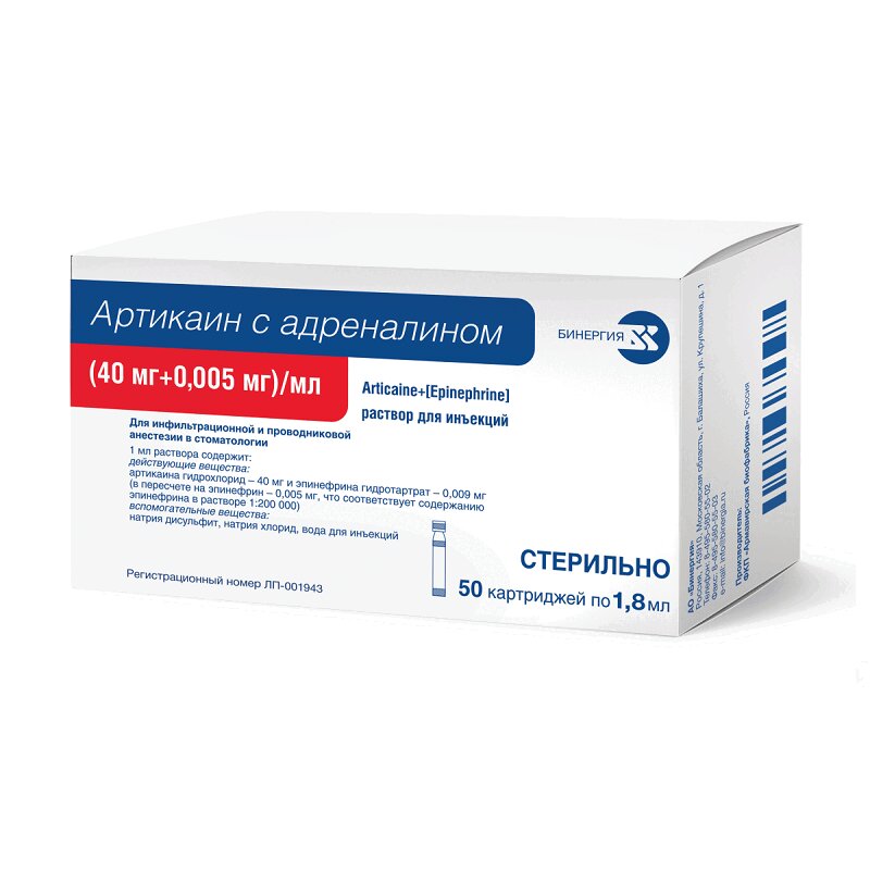 Артикаин с адреналином,применяемый для инфильтрационной и проводниковой анестезии в стоматологии, является комбинированным препаратом, в состав которого входит артикаин (местноанестезирующее средство амидного типа) и эпинефрин (сосудосуживающее средство), который добавляют в состав препарата для пролонгирования анестезии.