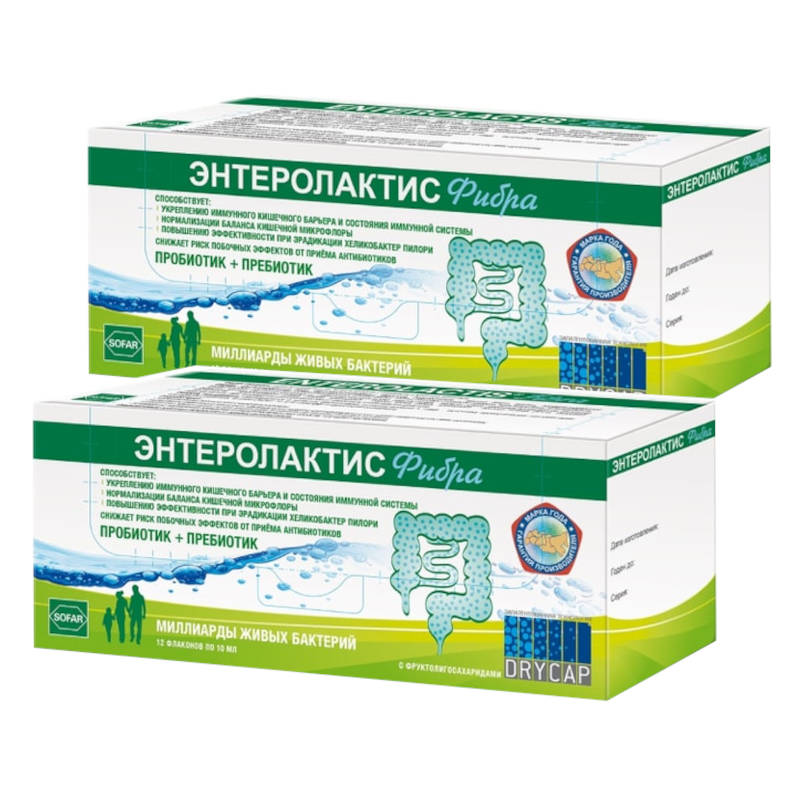 ЭНТЕРОЛАКТИС Фибра - это комбинация пробиотика (Lactobacillus paracasei, штамм CNCM I-1572 (L. casei DG)) и пребиотика (фруктоолигосахариды), которая способствует восстановлению нормальной микрофлоры кишечника и препятствует росту потенциально вредоносных бактерий.