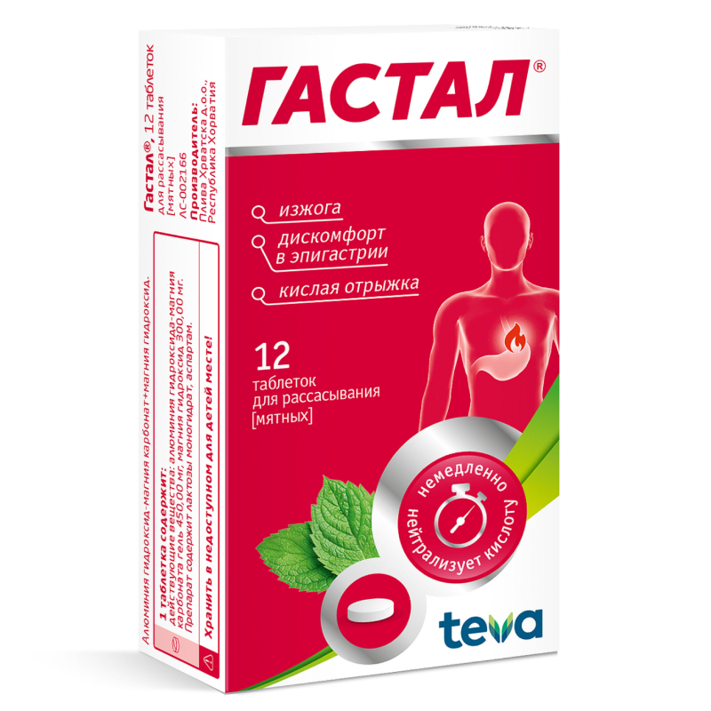 Гастал - комбинированный антацидный препарат для приема внутрь. Снижает повышенную кислотность желудочного сока до физиологического уровня и устраняет диспепсические расстройства за счет нейтрализации избытка соляной кислоты в желудке. Входящие в состав Гастала гидроксид магния и гидроксид алюминия обеспечивают быструю и длительную нейтрализацию, обусловливающую антацидный эффект.