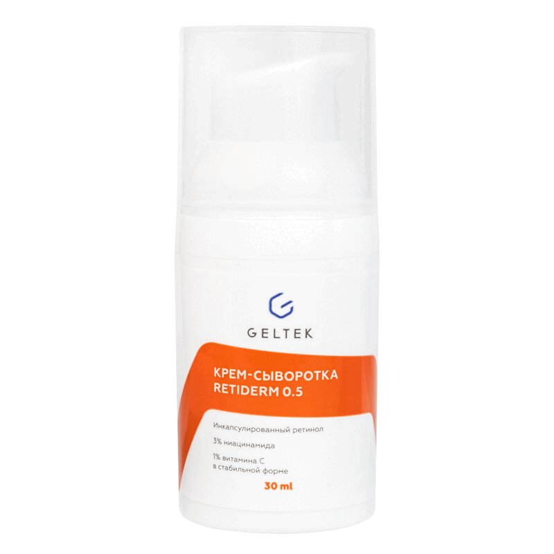 Крем-сыворотка Retiderm 0.25 – это лёгкая, кремообразная сыворотка, содержащая 0.25% активного ретинола двух видов: свободного и инкапсулированного в липосомах. Крем-сыворотка эффективно борется с морщинами и другими признаками фото- и хроностарения, пигментацией, воспалениями, потерей эластичности, расширенными порами, выравнивает рельеф кожи и значительно улучшает цвет лица. Выверенное сочетание ингредиентов с доказанной anti-age эффективностью, таких как ретинол и ниацинамид, и мощных антиоксидантов (витаминов С и Е), а также пребиотических, питательных и интенсивно увлажняющих компонентов, позволило создать средство, обладающее способностью заставить возрастную кожу функционировать, как в молодости. Крем-сыворотка Retiderm 0.25 значительно улучшает качество кожи, максимально восстанавливая её упругость, эластичность, способствуя появлению естественной гладкости и сияния. Кроме того, препарат балансирует выработку себума, уменьшает выраженность возрастного акне, стимулирует обновление эпидермиса, улучшает микроциркуляцию и делает тон кожи равномерным.