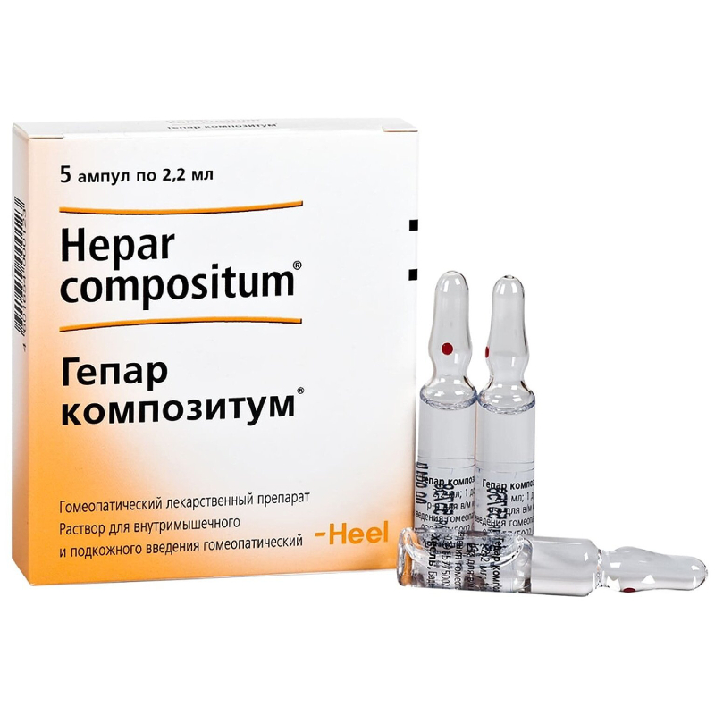Раствор для в/м и п/к введения гомеопатический бесцветный или светло-розового цвета, прозрачный, без запаха. 1 амп. Hepar suis (гепар суис) D8 22 мкл Cyanocobalaminum (цианокобаламин) D4 22 мкл Duodenum suis (дуоденум суис) D10 22 мкл Thymus suis (тимус суис) D10 22 мкл Colon suis (колон суис) D10 22 мкл Vesica fellea suis (везика фелеа суис) D10 22 мкл Pankreas suis (панкреас суис) D10 22 мкл China (хинное дерево) D4 22 мкл Lycopodium clavatum (плаун булавовидный) D4 22 мкл Chelidonium majus (чистотел большой) D4 22 мкл Silybum marianum (расторопша пятнистая) D3 22 мкл Histaminum (гистамин) D10 22 мкл Sulfur (сера) D13 22 мкл Avena sativa (овес посевной) D6 22 мкл Fel tauri (фел таури) D8 22 мкл Natrium oxalaceticum (натрия диэтилоксалацетат) D10 22 мкл Acidum α-ketoglutaricum (кислота α-кетоглутаровая) D10 22 мкл Acidum malicum (кислота яблочная) D10 22 мкл Acidum fumaricum (кислота фумаровая) D10 22 мкл Acidum alpha-liponicum (кислота альфа-липоевая) D8 22 мкл Acidum oroticum monohydricum (кислота оротовая) D6 22 мкл Cholesterinum (холестерин) D10 22 мкл Calcium carbonicum Hahnemanni (кальция карбонат субстанция по Ганеману) D28 22 мкл Taraxacum officinale (одуванчик лекарственный) D4 22 мкл Cynara scolymus (артишок колючий) D6 22 мкл Veratrum album (черемица белая) D4 22 мкл Вспомогательные вещества: натрия хлорид (для установления изотонии), вода д/и. 2.2 мл - ампулы бесцветного стекла (5) - упаковки ячейковые контурные пластиковые (1) - пачки картонные.2.2 мл - ампулы бесцветного стекла (5) - упаковки ячейковые контурные пластиковые (20) - пачки картонные.