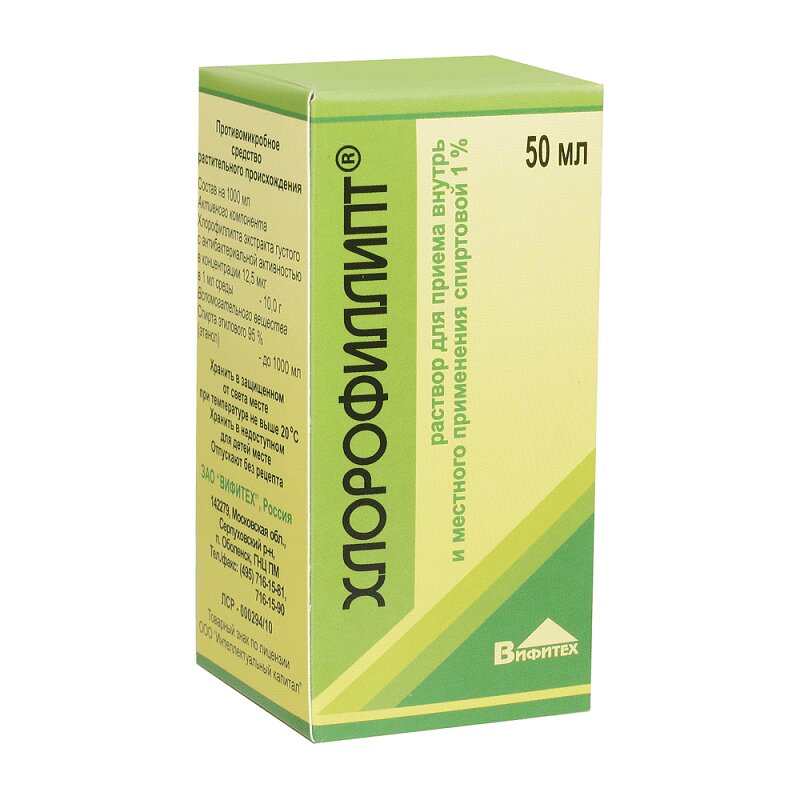 Раствор для приема внутрь и местного применения спиртовой 1% 1 мл хлорофиллипта экстракт густой (с антибактериальной активностью в концентрации 12.5 мкг в 1 мл среды) 10 мг 25 мл - флаконы темного стекла (1) - пачки картонные.50 мл - флаконы темного стекла (1) - пачки картонные.100 мл - флаконы темного стекла (1) - пачки картонные.