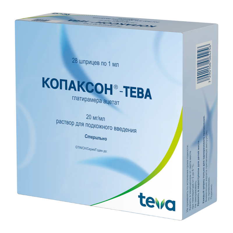 Режим дозированияПрепарат назначают взрослым ежедневно п/к в дозе 20 мг (1 заполненный шприц для инъекций) 1 раз/сут предпочтительно в одно и то же время, длительно. Копаксон®-Тева нельзя вводить в/в и в/м.Правила проведения инъекцииБлистер с заполненным шприцом после хранения в холодильнике следует выдержать при комнатной температуре не менее 20 мин. Раствор вводят п/к (соблюдая правила асептики и антисептики) в области предплечья, живота (область желудка), ягодицы или бедра, ежедневно меняя места введения. Не следует делать инъекции в болезненные точки, обесцвеченные, покрасневшие участи кожи или области с уплотнениями и узелками. Следует постоянно менять точки инъекций внутри инъекционной области.Рекомендуется составить схему смены мест инъекций и иметь ее при себе. Может потребоваться помощь другого человека для проведения инъекции.При наличии нерастворенных частиц или изменении цвета раствор препарата использованию не подлежит. Каждый шприц, содержащий раствор препарата, предназначен только для однократного применения; оставшийся раствор препарата следует уничтожить.Не следует смешивать раствор, содержащийся в шприце, или вводить его параллельно с каким-либо другим препаратом.При самостоятельном введении препарата в случае пропуска инъекции, пациент должен сделать ее немедленно, как только вспомнит об этом. Не допускается вводить двойную дозу препарата. Следующую инъекцию следует сделать только через 24 ч.Не следует прекращать применение препарата Копаксон®-Тева без консультации с врачом.Введение препарата1. Достать шприц из индивидуальной контурной ячейковой упаковки, удалив бумажную маркировку (полоску).2. Взять шприц в руку, которой пишете. Снять защитный колпачок с иглы.3. Предварительно обработав местно инъекции ватной салфеткой со спиртовым раствором, слегка собрать кожу в складку большим и указательным пальцами.4. Располагая шприц перпендикулярно к месту инъекции, ввести иглу в кожу под углом 90°, ввести препарат, равномерно нажимая на поршень шприца вниз до конца (до полного его опорожнения).5. Извлечь шприц с иглой движением вертикально вверх, сохраняя прежний угол наклона.6. Поместить шприц в контейнер для утилизации.ПередозировкаДанных о передозировке препарата Копаксон®-Тева не имеется.Противопоказания к применениюповышенная чувствительность к глатирамера ацетату или маннитолу.Препарат не рекомендуют применять у детей и подростков в возрасте до 18 лет, поскольку адекватных и строго контролируемых клинических исследований безопасности применения препарата у этого контингента больных не проводилось.Применение у детейПрепарат не рекомендуют применять у детей и подростков в возрасте до 18 лет, поскольку адекватных и строго контролируемых клинических исследований безопасности применения препарата у этого контингента больных не проводилось.Ограничения для детейПротивопоказанОграничения для пожилых пациентовНет данныхОграничения при нарушениях функции печениНет данныхПрименение при беременности и кормлении грудьюАдекватные и хорошо контролируемые исследования безопасности применения глатирамера ацетата при беременности не проводились. Применение препарата Копаксон®-Тева при беременности возможно только по абсолютным показаниям.Неизвестно, выделяется ли глатирамера ацетат с гру