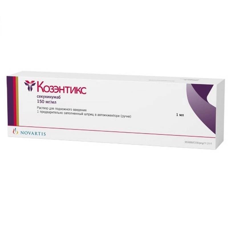 Механизм действия. Секукинумаб селективно связывается и нейтрализует провоспалительный цитокин — ИЛ-17А. Оказывает направленное действие на ИЛ-17 и ингибирование его взаимодействия с рецептором ИЛ-17, который экспрессируется разными типами клеток, включая кератиноциты и синовиоциты. В результате этого секукинумаб ингибирует высвобождение провоспалительных цитокинов, хемокинов и медиаторов повреждения тканей и снижает вклад ИЛ-17А в аутоиммунные и воспалительные заболевания. В клинически значимых концентрациях секукинумаб достигает кожи и снижает концентрацию местных воспалительных маркеров. Прямым следствием лечения секукинумабом является снижение выраженности покраснения, уплотнения и шелушения, являющихся результатом псориатического поражения.