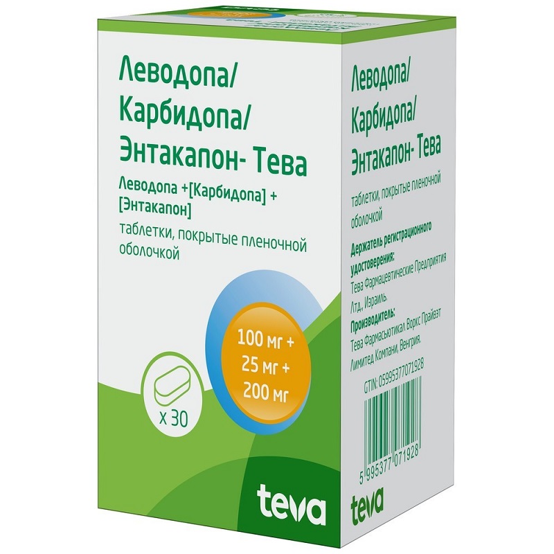 Энтакапон быстро всасывается из ЖКТ. Cmax при однократном приеме внутрь достигается через 1 ч. Индивидуальная биодоступность составляет 35% (при однократном приеме внутрь 200 мг). Связывается с белками плазмы крови на 98%, в основном с альбумином; в терапевтических концентрациях не вытесняет из связи с белками другие лекарственные средства с высокой степенью комплексообразования (в т.ч. варфарин, кислота салициловая, фенилбутазон, диазепам). Vd - 0.27 л/кг. Почти полностью метаболизируется. Подвергается эффекту "первого прохождения" через печень, небольшое количество энтакапона, являющегося (Е)-изомером, превращается в (Z)-изомер (составляет приблизительно 5% от общего количества энтакапона в плазме крови). Основной путь метаболизма энтакапона и его активного метаболита - конъюгирование с глюкуроновой кислотой. Выводится с мочой на 10-20% и с калом и желчью - на 80-90%. Общий клиренс составляет около 0.7 л/кг/ч. T1/2 составляет 0.4-0.7 ч. Вследствие короткого T1/2 при повторном назначении не происходит истинного накопления леводопы или энтакапона. Метаболизм энтакапона замедлен у больных с легкими и умеренными нарушениями функции печени (классы А и Б по шкале Чайлд-Пью), что приводит к увеличению концентрации энтакапона в плазме крови как в фазе поглощения, так и в фазе выведения.