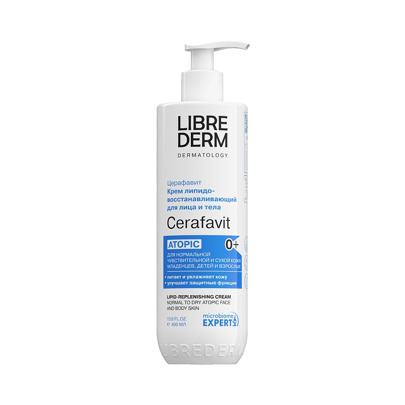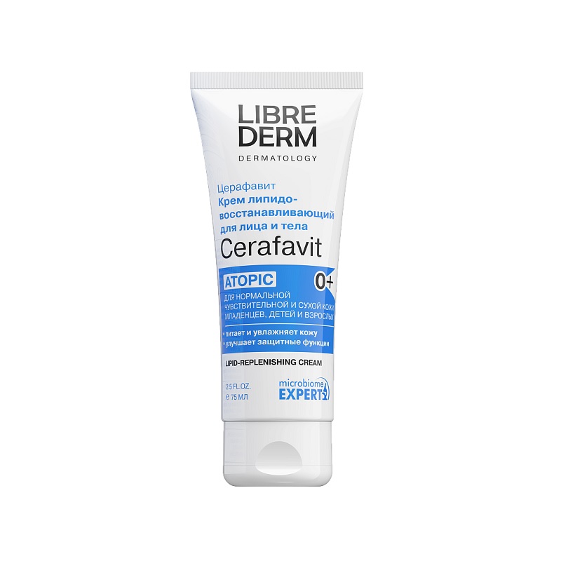 Липидовосстанавливающий крем CERAFAVIT разработан для ежедневного ухода за сухой, чувствительной и атопической кожей 0+. Специальная формула средства с ключевыми липидами здоровой кожи (витамином F, церамидами, холестеролом) и пребиотиком мгновенно устраняет сухость и ощущение стянутости, помогает уменьшить зуд и раздражения, поддерживая защитный барьер и микробиом кожи. Без красителей и парабенов. Гипоаллергенная отдушка. КЛИНИЧЕСКИ ДОКАЗАННАЯ ЭФФЕКТИВНОСТЬ И БЕЗОПАСНОСТЬ: Применение средств Cerafavit с церамидами и пребиотиком в три раза уменьшает проявления сухости, покраснения и зуда; * Более чем в два раза снижает потребность в топических гормональных средствах; * Безопасно с первых дней жизни. ** *Открытое сравнительное исследование «Изучение клинической эффективности, безопасности и переносимости косметического средства LIBREDERM «CERAFAVIT с церамидами и пребиотиком» N = 30, от 1 года до 18 лет. Период – 3 месяца. На базе Федерального государственного автономного учреждения "Национальный медицинский исследовательский центр здоровья детей" Минздрава России. Главный исследователь: Мурашкин Н.Н., д.м.н., проф