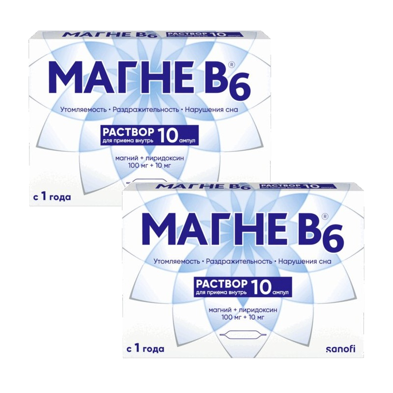 Режим дозирования Перед приемом препарата пациенту необходимо проконсультироваться с врачом. Препарат можно применять у детей в возрасте от 1 года. Взрослым рекомендуется принимать 3-4 ампулы/сут. Детям старше 1 года (масса тела более 10 кг) - суточная доза составляет 10-30 мг магния/кг массы тела (0.4-1.2 ммоль магния/кг/сут) или 1-4 ампулы. Суточную дозу следует разделить на 2-3 приема и принимать во время еды. Раствор из ампул перед приемом растворяют в 1/2 стакана воды. Лечение следует прекратить после нормализации концентрации магния в крови. Инструкция по приготовлению питьевого раствора 1. Взять стакан и наполнить его водой наполовину. 2. Ампулы с Магне B6® не требуют использования пилочки. Чтобы открыть ампулу, следует взять ее за кончик, предварительно покрыв ее куском ткани. 3. Резким движением отломить кончик сначала с одного заостренного конца. 4. Направить открытый первым конец ампулы в стакан с водой под углом так, чтобы второй кончик ампулы не находился над стаканом. 5. Отломить второй кончик ампулы, и ее содержимое выльется в стакан. 6. Самонадламывающиеся ампулы с Магне В6® не требуют использования пилочки. Передозировка При нормальной функции почек передозировка магния при его приеме внутрь обычно не приводит к возникновению токсических реакций. Однако в случае почечной недостаточности возможно развитие отравления магнием. Выраженность симптомов зависит от концентрации магния в крови. Симптомы: снижение АД, тошнота, рвота, угнетение ЦНС, снижение рефлексов, изменения на ЭКГ, угнетение дыхания, кома, остановка сердца и паралич дыхания, анурический синдром. Лечение: регидратация, форсированный диурез. При почечной недостаточности необходим гемодиализ или перитонеальный диализ. Противопоказания к применению повышенная чувствительность к действующим веществам и любым другим компонентам препарата; почечная недостаточность тяжелой степени (КК менее 30 мл/мин); детский возраст до 1 года; одновременный прием леводопы. С осторожностью: почечная недостаточность средней степени тяжести (риск развития гипермагниемии). Применение у детей Противопоказание: детский возраст до 1 года. Ограничения для детей Применяется с осторожностью Ограничения для пожилых пациентов Нет данных Ограничения при нарушениях функции печени Нет данных Применение при беременности и кормлении грудью Беременность Клинический опыт применения препарата у достаточного количества беременных женщин не выявил какого-либо неблагоприятного влияния на возникновение пороков развития плода или фетотоксического действия. Магне В6® можно применять при беременности только в случае необходимости, по рекомендации врача. Период грудного вскармливания Магний проникает в грудное молоко. Следует избегать применения препарата в период грудного вскармливания. Ограничения при беременности Применяется с осторожностью Ограничения при кормлении грудью Противопоказан Применение при нарушениях функции почек С осторожностью назначают препарат при почечной недостаточности средней степени. Препарат противопоказан при почечной недостаточности тяжелой степени (КК менее 30 мл/мин). Ограничения при нарушениях функции почек Применяется с осторожностью