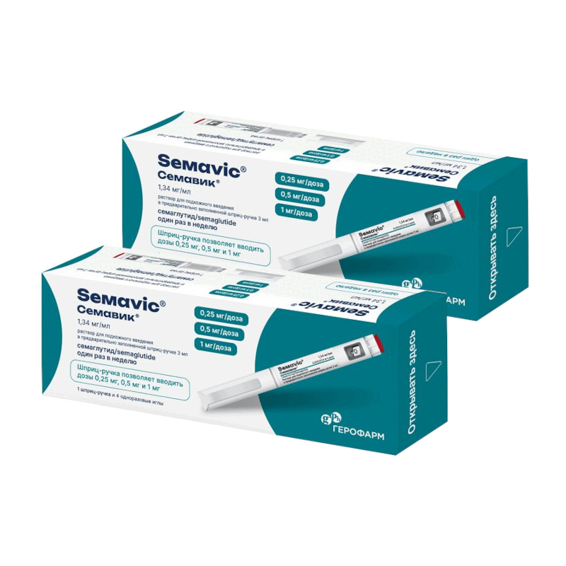 Действующее вещество препарата Семавик - семаглутид. Семаглутид является агонистом рецепторов ГПП-1 (ГПП-1Р), произведенным химическим синтезом. Семаглутид действует как минимум на 6 из 8 звеньев патогенеза развития СД 2-го типа, благоприятно влияя на развитие и исход заболевания и улучшая качество жизни. Фармакологические концентрации семаглутида снижают концентрацию глюкозы крови и массу тела. Семаглутид оказывает положительное влияние на липиды плазмы крови, снижает систолическое артериальное давление и инсулинорезистентность. Семаглутид снижает общую массу тела и массу жировой ткани, уменьшая потребление энергии. Данный механизм затрагивает общее снижение аппетита, включая усиление сигналов насыщения и ослабление сигналов голода, а также улучшение контроля потребления пищи и снижение тяги к пище. Помимо этого, семаглутид снижает предпочтение к приёму пищи с высоким содержанием жиров. Период полувыведения семаглутида (около 1 недели) позволяет применять его подкожно (п/к) 1 раз в неделю.
