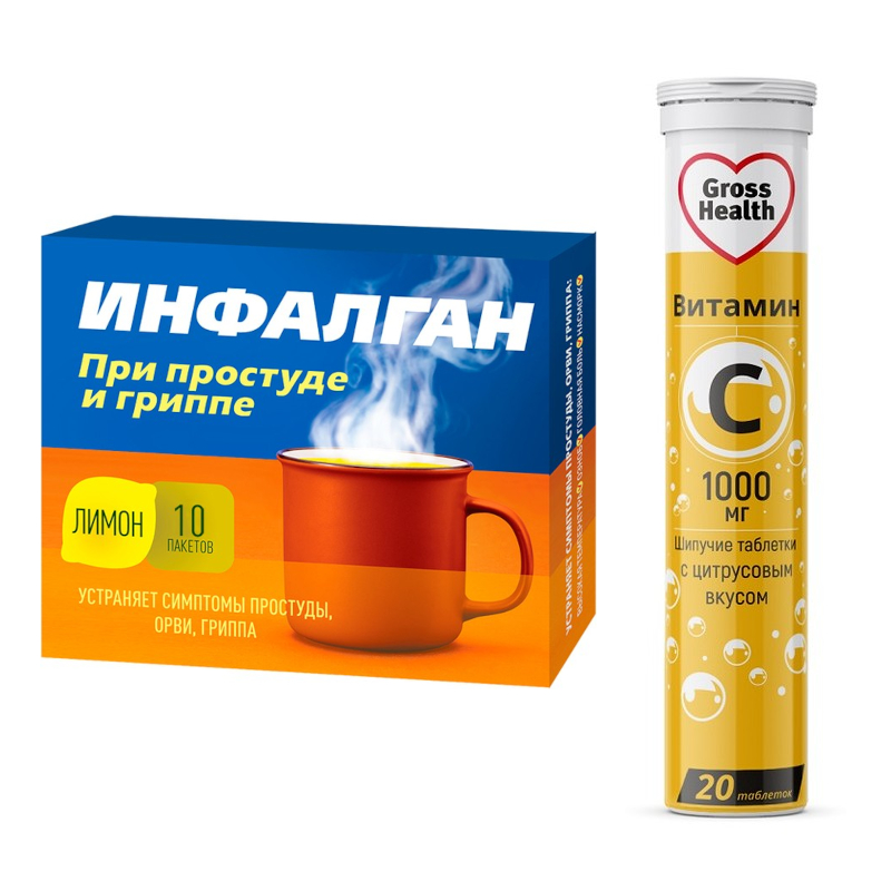 Действующие вещества: парацетамол 325,00 мг, фенилэфрина гидрохлорид 10,00 мг, фенирамина малеат 20,00 мг, аскорбиновая кислота 50,00 мг; Вспомогательные вещества: лактозы моногидрат 4492,75 мг, ароматизатор лимонный 42,00 мг, аспартам (Е951) 30,00 мг, кремния диоксид коллоидный 20,00 мг, гипромеллоза 10,00 мг, рибофлавин (Е101) 0,25 мг.