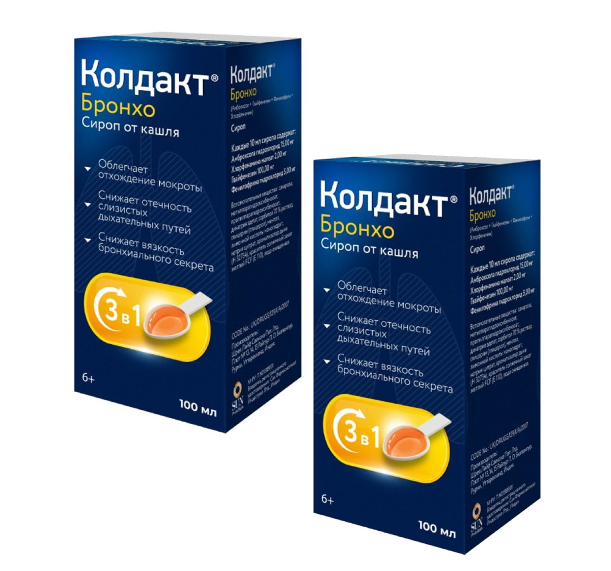 Режим дозирования Перед применением взбалтывать. Рекомендуемая доза для взрослых и детей старше 12 лет: 20 мл (4 чайные ложки) 3 раза/сут. Рекомендуемая доза для детей 6-12 лет: 10 мл (2 чайные ложки) 2-3 раза/сут. Прием препарата следует равномерно распределить в течение всего дня. Передозировка Симптомы: усиление выраженности побочных эффектов. Лечение: промывание желудка, назначение активированного угля, слабительных средств (вазелиновое масло, солевые слабительные); симптоматическая терапия. При выраженных нарушениях следует обратиться к врачу. Противопоказания к применению гиперчувствительность к какому-либо компоненту препарата; одновременный прием других препаратов, содержащих вещества, входящие в состав Колдакт Бронхо; одновременный прием трициклических антидепрессантов, ингибиторов МАО, бета-адреноблокаторов; судороги любой этиологии; выраженный атеросклероз коронарных артерий; артериальная гипертензия; сахарный диабет; тиреотоксикоз; феохромоцитома; закрытоугольная глаукома; язвенная болезнь желудка и двенадцатиперстной кишки; аденома предстательной железы; дефицит фермента глюкозо-6-фосфатдегидрогеназы; беременность; период лактации; детский возраст (до 6 лет). С осторожностью — почечная и/или печеночная недостаточность. Применение у детей Рекомендуемая доза для детей 6-12 лет: 10 мл (2 чайные ложки) 2-3 раза в день. Прием препарата следует равномерно распределить в течение всего дня. Противопоказано детям до 6 лет. Ограничения для детей Применяется с осторожностью Применение у пожилых пациентов У пожилых пациентов возможны спутанность сознания или раздражительность. Ограничения для пожилых пациентов Применяется с осторожностью Применение при нарушениях функции печени При печеночной недостаточности применять с осторожностью. Ограничения при нарушениях функции печени Применяется с осторожностью Применение при беременности и кормлении грудью Противопоказано при беременности. На время лечения следует прекратить грудное вскармливание. Ограничения при беременности Противопоказан Ограничения при кормлении грудью Противопоказан Применение при нарушениях функции почек При почечной недостаточности применять с осторожностью. Ограничения при нарушениях функции почек Применяется с осторожностью