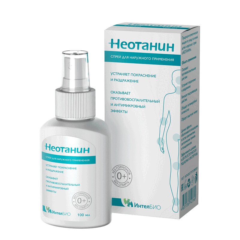 При остром воспалении с зудом и высыпаниями (мокнутием) применяется НЕОТАНИН лосьон (суспензия): • двойное противозудное действие • быстрый противозудный эффект (в течение нескольких минут) • противовоспалительное и вяжущее действие с антисептическим эффектом • более выраженный клинический эффект и сокращение сроков лечения по сравнению c классическими формами местной терапии • не содержит гормонов • применение не приводит к системным побочным эффектам • применяется у детей с рождения • при локализации поражения на лице • при обширных (более 20% поверхности кожи) площадях поражения • у пациентов со стероидофобией (20—40% пациентов) • у пациентов с тяжелой сопутствующей соматической патологией • минимальный риск побочных реакций • не окрашивает кожу • отпускается без рецепта • доступная цена. Механизм действия: Основным активным компонентом НЕОТАНИНА является синтетический танин. Танины относятся к веществам, оказывающим вяжущее, подсушивающее действие благодаря способности связывать и осаждать протеины (белки). Синтетический танин оказывает противовоспалительное действие (устраняет зуд, отек и покраснение), оказывает противомикробное действие, ускоряет заживление. Вторым активным компонентом НЕОТАНИНА является полидоканол, который обладает противозудным действием. Противозудный эффект полидоканола развивается быстро, длительность действия составляет в среднем 3–4 часа. Также полидоканол усиливает вяжущее, подсушивающее действие танина и способствует заживлению эрозий. Третьим активным компонентом НЕОТАНИНА лосьона (суспензии) является оксид цинка. Оксид цинка относится к веществам, оказывающим: вяжущий эффект – связывает белки кожи и белки тканевой жидкости в тонкую пленку на поверхности кожи и подсушивающее действие - уменьшает выраженность экссудативных процессов. Оксид цинка оказывает противовоспалительное и противомикробное действие. Область применения: Состояния кожи, сопровождающиеся зудом, нарушением целостности кожного покрова и высыпаниями (мокнутием) В том числе: • при обострении атопического, аллергического, контактного дерматита, экземе, псориазе и т.п. • при пеленочном дерматите • при ветряной оспе, герпесе, опоясывающем лишае и т.п. • при грибковых поражениях кожи с эрозиями и трещинами • при поверхностных пиодермиях • при всех дерматозах, сопровождающихся зудом (т.к. в составе полидоканол, который оказывает противозудное действие сразу после нанесения на кожу) • при солнечных и бытовых ожогах Период беременности и кормления грудью: НЕОТАНИН можно использовать в период беременности и кормления грудью. Однако в период кормления грудью не следует использовать средство в области молочных желез, чтобы избежать случайного перорального попадания препарата в организм младенца во время кормления.