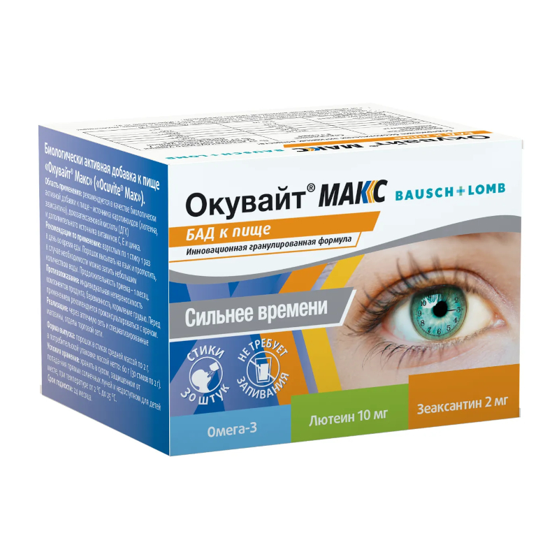 Биологически активная добавка к пище "Окувайт® Макс капс" (капсула средней массы 735 мг). Область применения: в качестве биологически активной добавки к пище - источника лютеина и зеаксантина, дополнительного источника витаминов С и Е, минеральных веществ: меди, селена, цинка.