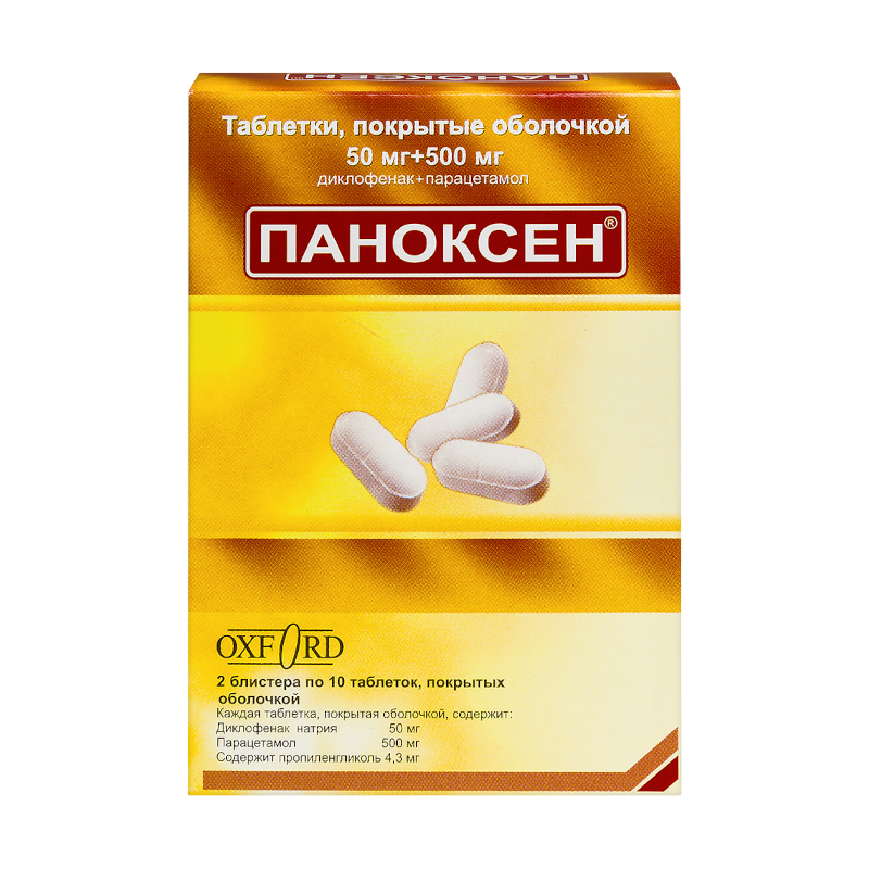 Действующие вещества: диклофенак натрия - 50 мг, парацетамол - 500 мг.