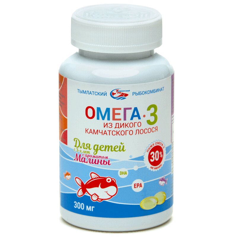 1 капсула содержит (300мг) рыбного жира из дальневосточных лососевых видов рыб (в т.ч., дикого камчатского лосося) (ПНЖК омега-3 – не менее 30%), желатин, глицерин (агент влагоудерживающий), вода, смесь токоферолов (антиокислитель), натуральный пищевой ароматизатор (малина).