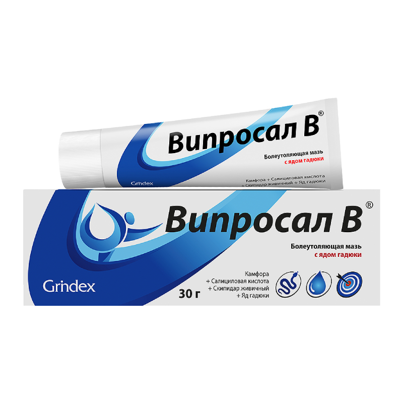 Действующие вещества: яд гадюки обыкновенной – 5 мышиных единиц действия (МЕД), кислота салициловая – 1 г, камфора синтетическая – 3 г, скипидар живичный – 3 г; Вспомогательные вещества: эмульгатор № 1 (ЛанеттеSX) – 8 г, парафины нефтяные твердые – 3 г, вазелин – 7 г, глицерол (глицерин) – 2 г, натрия хлорид – 0,072 г, вода очищенная - до 100 г.