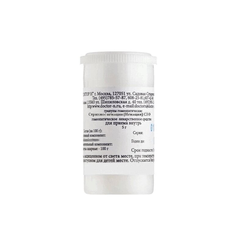 Состав (на 100 г) активный компонент: Strychnos ignatii (Ignatia) C30 - 1,0 г вспомогательный компонент: гранулы сахарные - 100 г