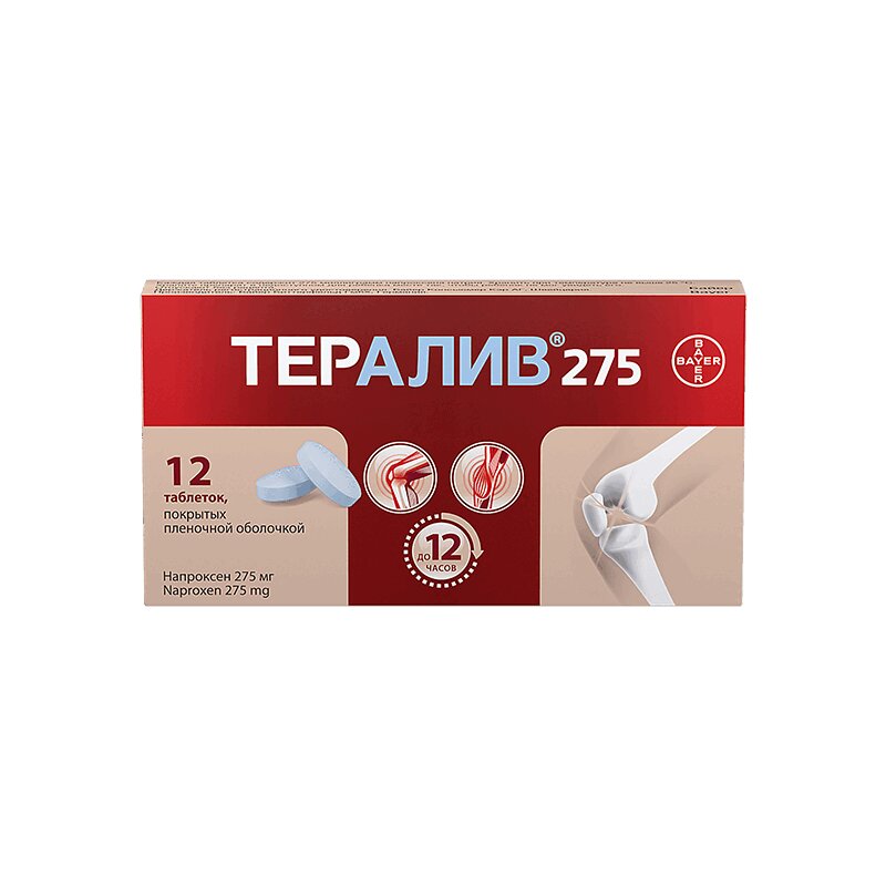 Препарат Тералив® 275 представляет собой напроксен, обладает обезболивающим, жаропонижающим и противовоспалительным действием. Механизм действия связан с неселективным ингибированием активности циклооксигеназы-1 и -2 (ЦОГ-1, ЦОГ-2).