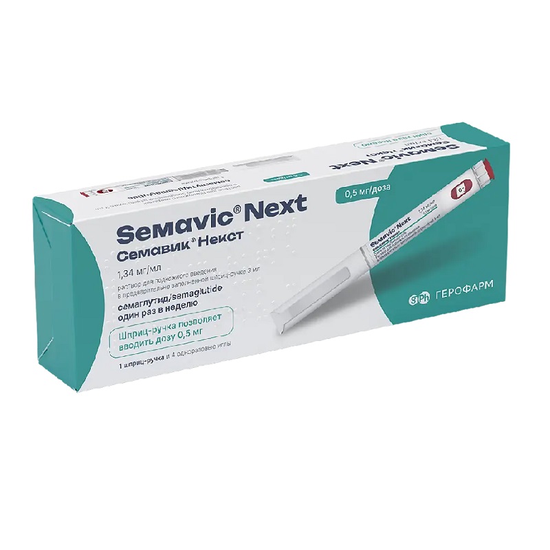 * в одной предварительно заполненной шприц-ручке содержится 2 мг семаглутида в 1.5 мл раствора препарата, что соответствует 4 дозам по 0.5 мг семаглутида.