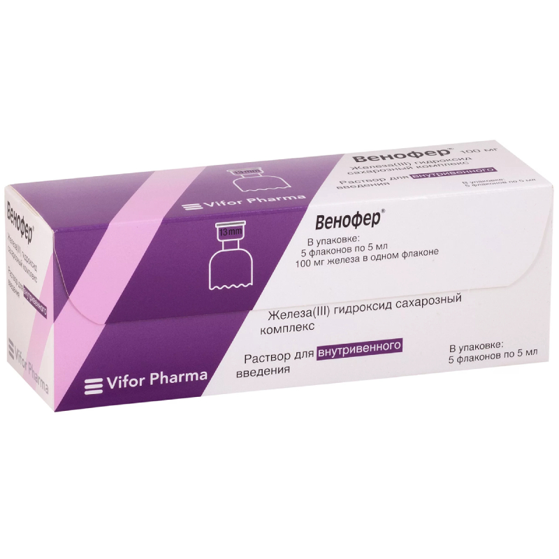 Струйное введение: препарат Венофер® также можно вводить в виде неразведенного раствора в/в медленно, со скоростью (норма) 1 мл препарата Венофер® (20 мг железа) в мин; 5 мл препарата Венофер® (100 мг железа) следует вводить минимум за 5 мин. Максимальный объем препарата не должен превышать 10 мл препарата Венофер® (200 мг железа) за 1 инъекцию.