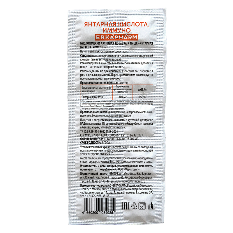 Янтарная кислота. Содержание активных веществ в 1 таблетке: Янтарная кислота 90-100 мг Вспомогательные вещества: Глюкоза, крахмал картофельный, кальция стеарат, тальк