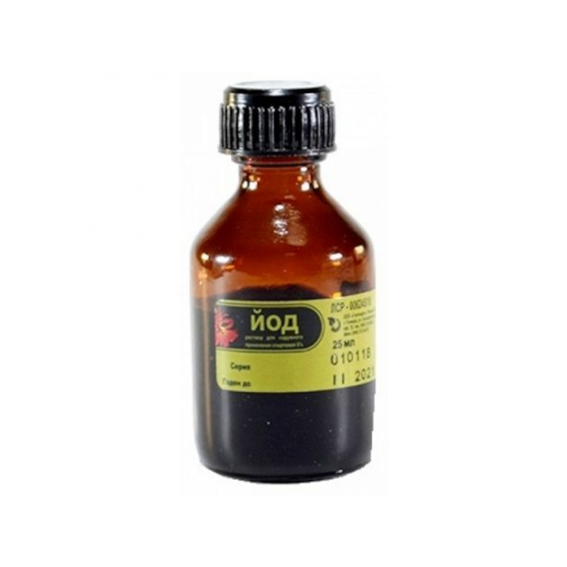 Раствор для наружного применения спиртовой 5% 100 мл йод 5 г Вспомогательные вещества: калия йодид, этанол 95%. 10 мл - флаконы темного стекла (1) - пачки картонные.25 мл - флаконы темного стекла (1) - пачки картонные.100 мл - флаконы темного стекла (1) - пачки картонные.