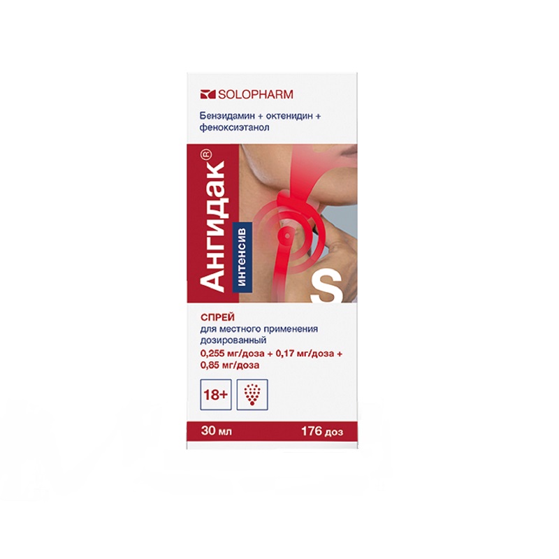Ангидак Интенсив спрей дозируемый флакон 0,255 мг/доза+0,17 мг/доза+0,85 мг/доза 176доз фл.30 мл