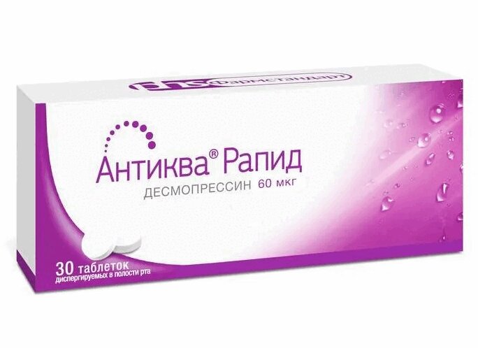 Структурный аналог естественного пептидного гормона гипоталамуса аргинин-вазопрессина, полученный в результате изменений в строении молекулы вазопрессина. Различие состоит в дезаминировании цистеина (в 1-й позиции) и замещении L-аргинина (в 8-й позиции) D-аргинином. Это ведет к существенной пролонгации антидиуретического действия и менее выраженному действию на гладкую мускулатуру сосудов и внутренних органов по сравнению с нативным аргинин-вазопрессином. Десмопрессин увеличивает проницаемость эпителия дистальных отделов извитых канальцев и повышает реабсорбцию воды, что приводит к уменьшению объема выделяемой мочи, повышению осмолярности мочи с одновременным снижением осмолярности плазмы крови, снижению частоты мочеиспусканий и уменьшению ноктурии (ночной полиурии). Антидиуретическое действие при приеме внутрь в дозе 0.1 мг сохраняется до 8 часов.
