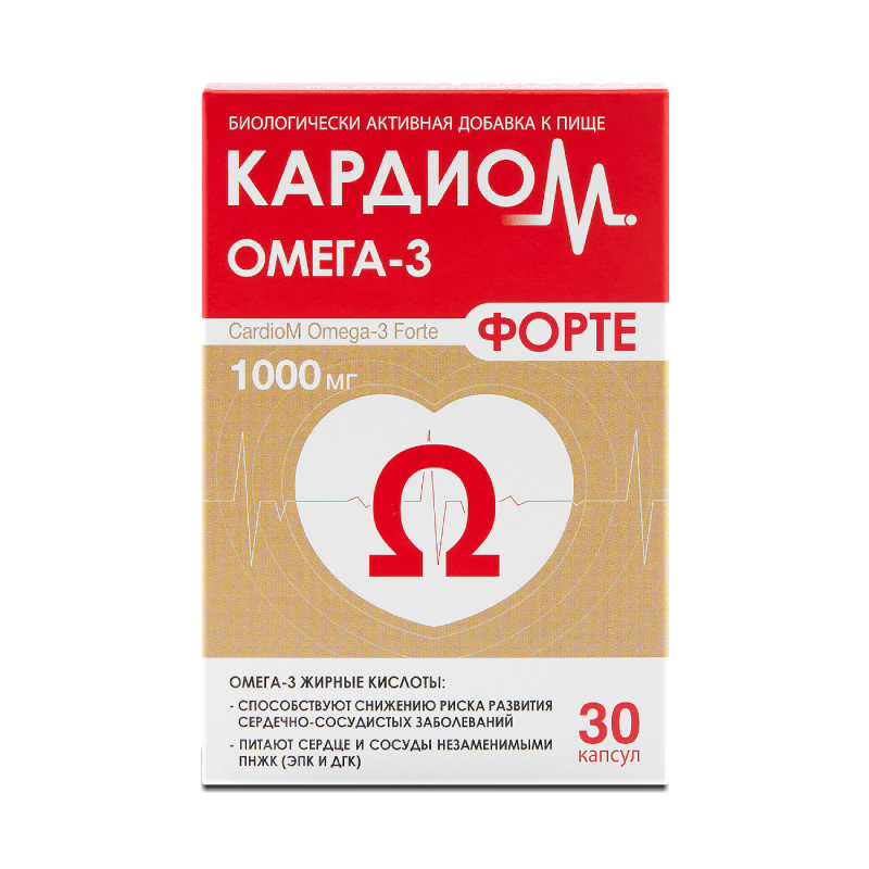 КардиоМ Омега-3 Форте: специальные витамины для поддержания здоровой работы сердца и снижения риска развития сердечно-сосудистых заболеваний Способствуют нормализации уровня «плохого холестерина, уменьшая риск образования бляшек Оказывают влияние на работу свертывающей системы крови, поддержание сосудистого тонуса и уровня артериального давления Суточная дозировка незаменимых ДГК и ЭПК составляет 900 мг – это эффективная дозировка, способная оказывать позитивное влияние на работу сердечно-сосудистой системы