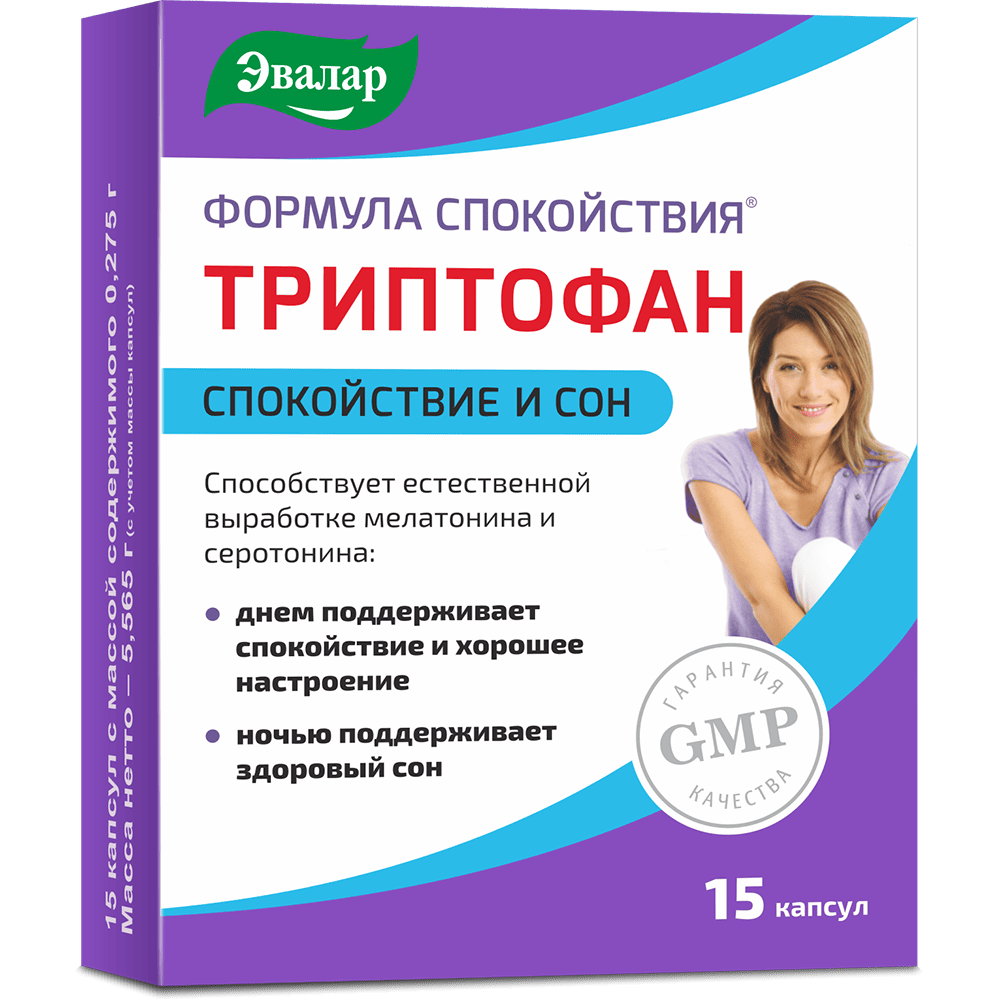 Биологически активная добавка к пище Формула спокойствия® Триптофан способствует синтезу в организме серотонина и мелатонина, поддерживает нормальный цикл "сон-бодрствование", в т.ч. помогает адаптироваться при смене часовых поясов (например, при перелетах). Днем способствует естественной выработке серотонина - "гормона счастья", создает ощущение приподнятого настроения и душевного комфорта, повышает работоспособность, снижает раздражительность, агрессивность, устраняет подавленное настроение, чувство тревоги, эмоционального напряжения. Ночью способствует естественной выработке мелатонина - "гормона сна", помогает легко и быстро заснуть, улучшает глубину и качество сна, способствует устранению проблемы прерывистого сна, позволяя полноценно выспаться и отдохнуть за более короткое время.