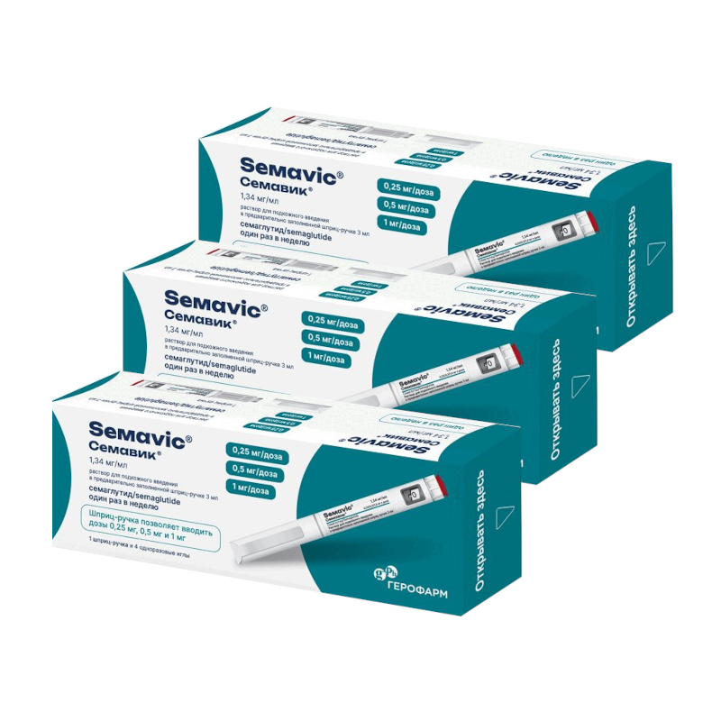 Действующее вещество препарата Семавик - семаглутид. Семаглутид является агонистом рецепторов ГПП-1 (ГПП-1Р), произведенным химическим синтезом. Семаглутид действует как минимум на 6 из 8 звеньев патогенеза развития СД 2-го типа, благоприятно влияя на развитие и исход заболевания и улучшая качество жизни. Фармакологические концентрации семаглутида снижают концентрацию глюкозы крови и массу тела. Семаглутид оказывает положительное влияние на липиды плазмы крови, снижает систолическое артериальное давление и инсулинорезистентность. Семаглутид снижает общую массу тела и массу жировой ткани, уменьшая потребление энергии. Данный механизм затрагивает общее снижение аппетита, включая усиление сигналов насыщения и ослабление сигналов голода, а также улучшение контроля потребления пищи и снижение тяги к пище. Помимо этого, семаглутид снижает предпочтение к приёму пищи с высоким содержанием жиров. Период полувыведения семаглутида (около 1 недели) позволяет применять его подкожно (п/к) 1 раз в неделю.