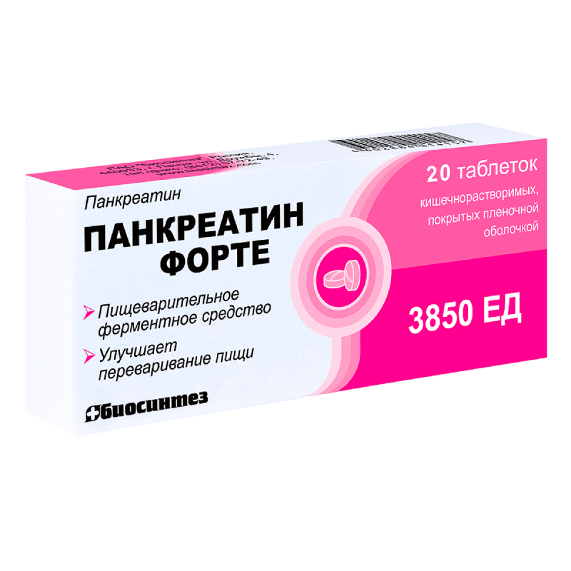 Таблетки, покрытые кишечнорастворимой оболочкой коричневого или темно-коричневого цвета, круглой, двояковыпуклой формы, со специфическим запахом. 1 таб.панкреатин, соответствующий ферментативной активности: амилазы не менее 4620 ЕД Ph.Eur. липазы не менее 3850 ЕД Ph.Eur. протеазы 275-500 ЕД Ph.Eur. Вспомогательные вещества: карбоксиметилкрахмал натрия (примогель) - 21.5 мг, крахмал прежелатинизированный (крахмал 1500) - 16.5 мг, повидон (поливинилпирролидон низкомолекулярный медицинский) - 5 мг, магния стеарат - 3.3 мг, кремния диоксид коллоидный (аэросил) - 3.3 мг, целлюлоза микрокристаллическая - до получения таблетки без оболочки массой 330 мг. Состав оболочки: целлацефат (ацетилфталилцеллюлоза) - 2.847 мг, полисорбат (твин 80) - 0.85 мг, парафин жидкий (масло вазелиновое) - 0.5 мг, оксид железа коричневый (сиковит 70 (E172), ферронат (E172)) - 0.803 мг. 20 шт. - банки (1) - пачки картонные.30 шт. - банки (1) - пачки картонные.60 шт. - банки (1) - пачки картонные.10 шт. - упаковки ячейковые контурные (2) - пачки картонные.10 шт. - упаковки ячейковые контурные (3) - пачки картонные.10 шт. - упаковки ячейковые контурные (6) - пачки картонные.