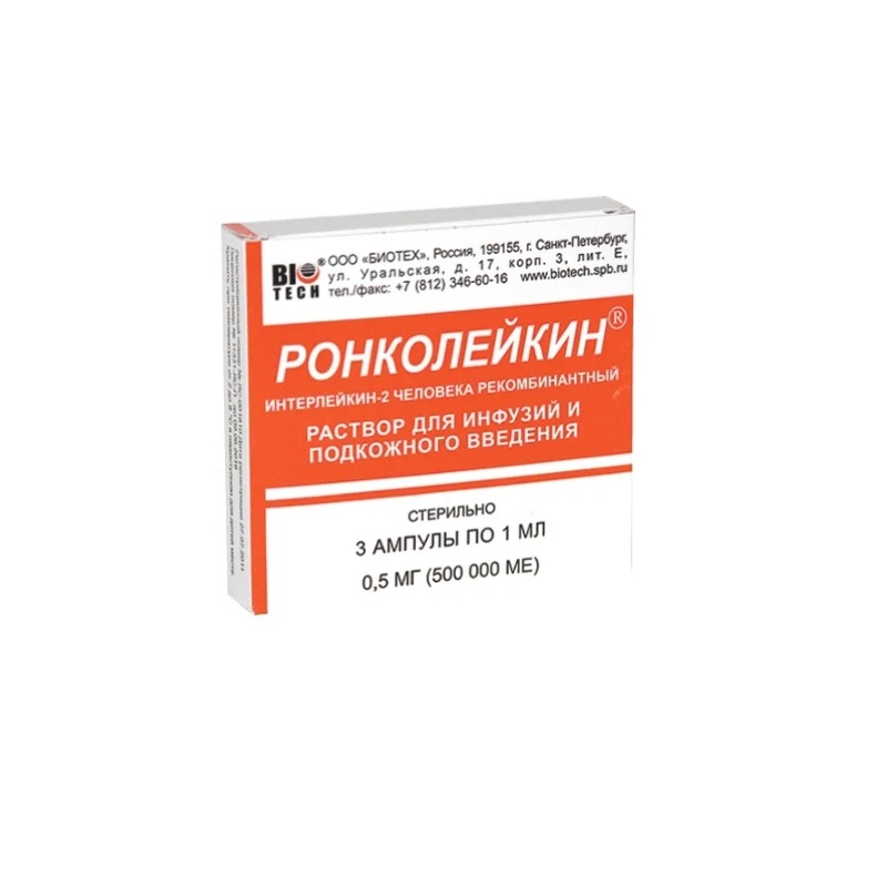Ронколейкин® вводят 1 раз/сут п/к или в/в капельно по 0.5-1.0 мг с интервалами 1-3 дня, на курс - 1-3 введения. Для в/в введения препарат из ампулы переносят в 400 мл изотонического раствора натрия хлорида для инъекций. Инфузия всего объема раствора осуществляется капельно в течение 4-6 ч.