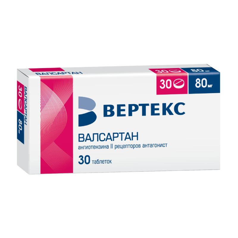 Таблетки, покрытые пленочной оболочкой розового цвета, круглые двояковыпуклые; на поперечном разрезе ядро белого или почти белого цвета. Фармакологическое действие Антигипертензивное средство. Является специфическим антагонистом рецепторов ангиотензина II. Оказывает избирательное антагонистическое действие на AT1-рецепторы, которые ответственны за реализацию эффектов ангиотензина II. Вследствие блокады AT1-рецепторов повышается плазменная концентрация ангиотензина II, который может стимулировать незаблокированные AT2-рецепторы. Не обладает агонистической активностью в отношении AT1-рецепторов. Сродство валсартана к AT1-рецепторам примерно в 20 000 раз выше, чем к AT2-рецепторам. Не ингибирует АПФ. Не взаимодействует и не блокирует рецепторы других гормонов или ионные каналы, имеющие важное значение для регуляции функций сердечно-сосудистой системы. Не оказывает влияния на уровень общего холестерина, ТГ, глюкозы и мочевой кислоты в плазме крови. Начало антигипертензивного действия валсартана после его применения внутрь в однократной дозе наблюдается в течение 2 ч после приема, максимальный эффект достигается в течение 4-6 ч. Показания активных веществ препарата Валсартан-Вертекс Лечение артериальной гипертензии. Лечение хронической сердечной недостаточности (II-IV функциональный класс по классификации NYHA) у пациентов, получающих традиционную терапию диуретиками, препаратами наперстянки, а также ингибиторами АПФ или бета-адреноблокаторами.