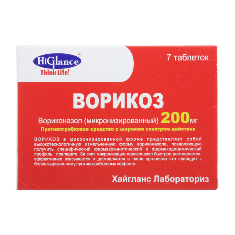 Вориконазол быстро и практически полностью всасывается после приема внутрь; Cmax в плазме крови достигается через 1-2 ч после приема. Биодоступность вориконазола при приеме внутрь составляет 96%, при повторном приеме с пищей с большим содержанием жиров Cmax и AUC снижаются на 34% и 24% соответственно. Всасывание вориконазола не зависит от рН желудочного сока.